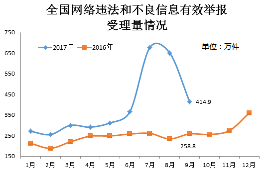 9月份全国网络违法和不良信息有效举报量达414.9万件,环比下降约36.2%,同比增长约60.3%。同时,全国网络举报部门直接处理或向执法部门转交有效举报约388.8万件,通过各类渠道向网民反馈处理结果389.6万件。