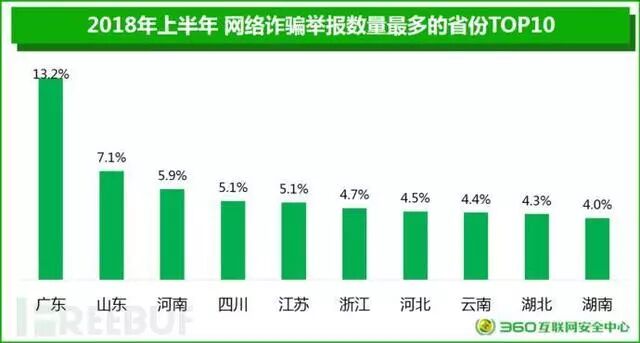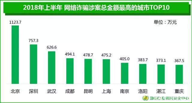 《报告》还对举报用户的地域分布做出了统计。举报量最多的城市依次为北京、深圳、广州、上海,“北上广深”齐齐中枪。从各城市网络诈骗涉案总金额来看,北京再次以1123.7万元位居榜首,其主要举报虚假兼职诈骗较多。洛阳以383.7万排名第8 位。从省份来说,上半年网络诈骗举报数量最多的省份中广东、山东、河南、四川、江苏排在前五位。