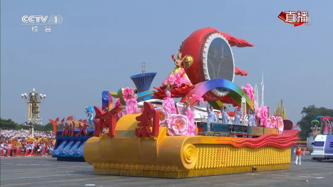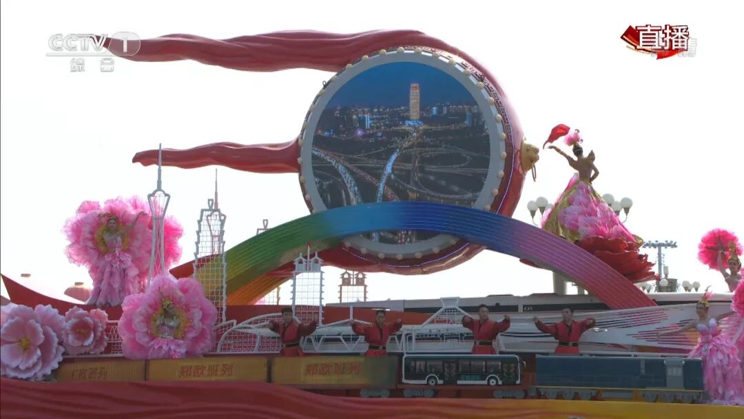河南彩车“出彩中原”,车身由盘鼓、丝绸带、高铁列车、郑欧班列、大型客车、城市天际线、彩虹桥、牡丹花等河南元素构成。综合展现了我省在文化、科技、对外开放等领域的成就。