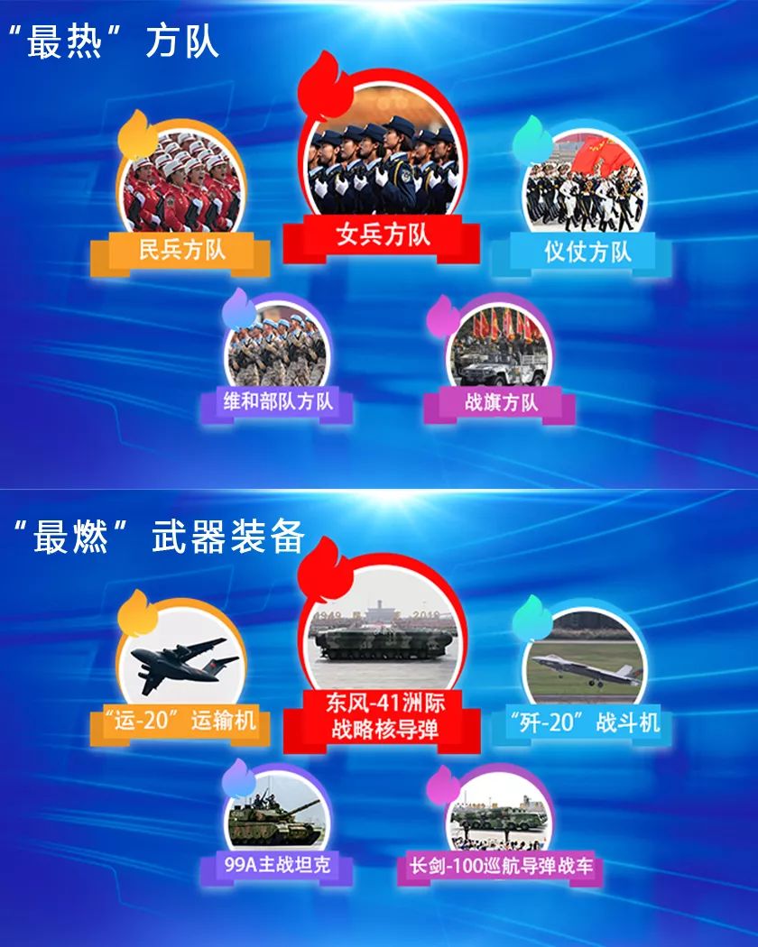 59个方(梯)队中,“女兵方队”以飒爽英姿获得网络最高的关注度,而网民最关注的武器装备毫无疑问花落“东风快递”。