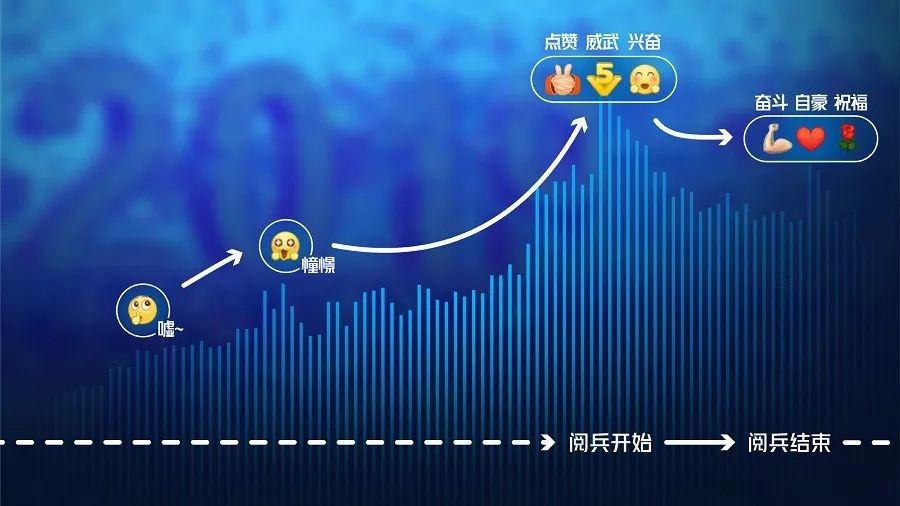 在这样一场震撼的视觉盛宴面前,网民纷纷表示“不淡定了”。新华睿思数据显示,网民的主要情绪由阅兵前的期待,到阅兵期间的兴奋、点赞,再到国庆阅兵后的自豪、震撼,相关留言和表情刷爆网络。