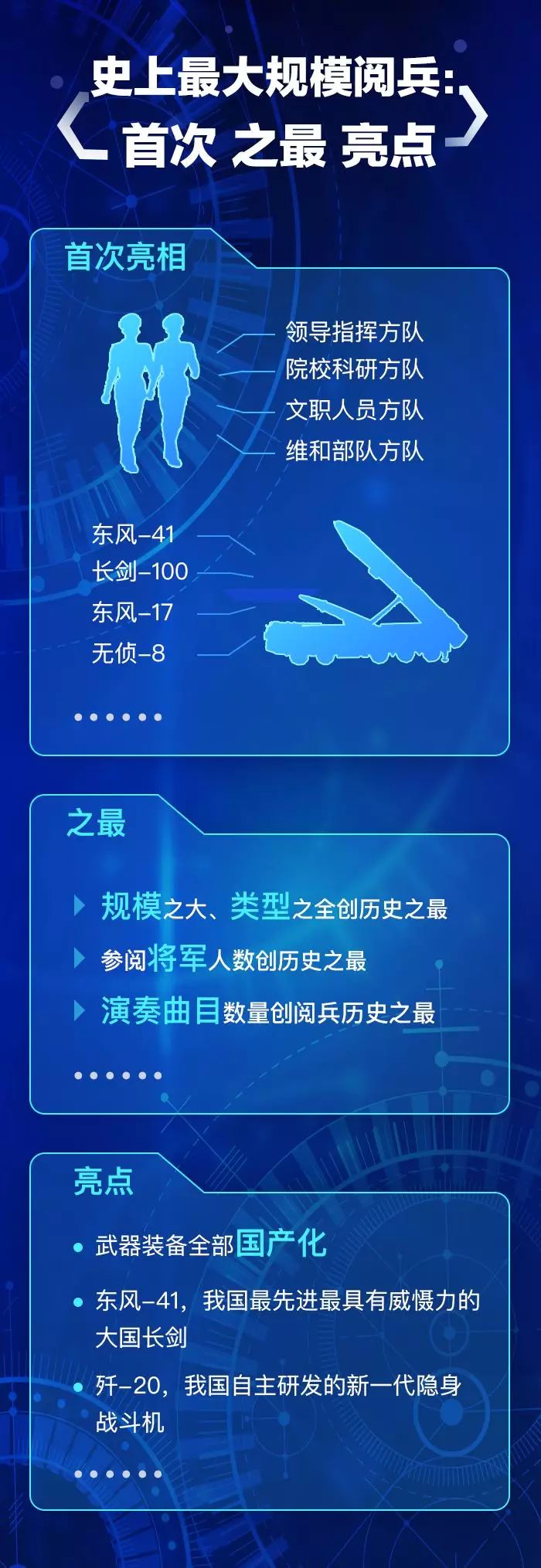 此次阅兵是中国特色社会主义进入新时代的首次国庆阅兵,也是人民军队改革重塑后的首次集中亮相。阅兵活动亮点纷呈,规模之大、类型之全创历史之最,编组之新、要素之全体现强军成果。
