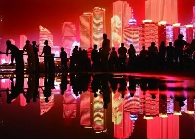 国庆期间,山东青岛浮山湾举行灯光秀,图为市民和游客在五四广场观看表演。新华社发