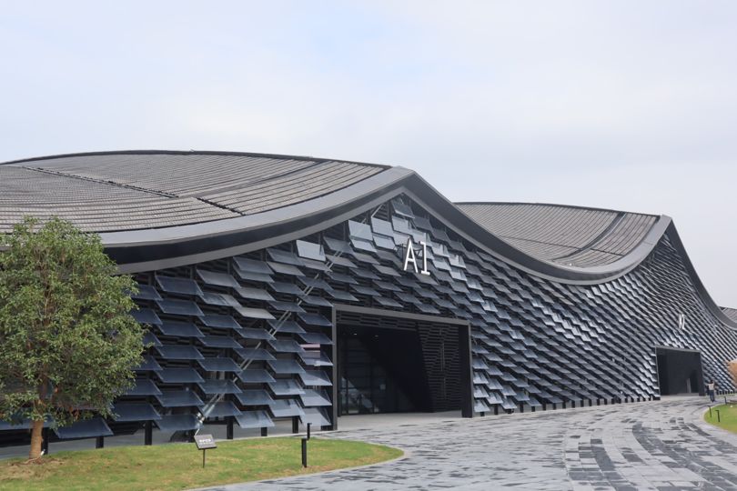 互联网之光博览中心坐落于会展中心东侧,主展馆以黑白两色为主基调,与乌镇传统水乡建筑风格遥相呼应。从空中看,整个展馆由五段连续的弧线组成,形似一只昂首前行的春蚕,蕴含着结茧化蝶,互联网新技术、新企业从这里腾飞的美好寓意。“一拱一链”的设计,实现了展馆内部没有一根立柱的效果,使展馆空间得到最大化利用。