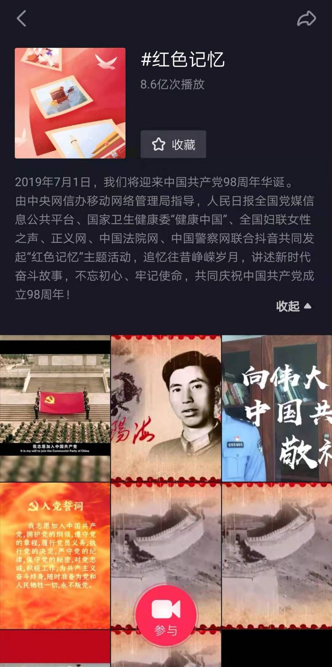 2019年七一建党节,由中央网信办移动网络管理局指导,人民日报全国党媒信息公共平台、国家卫生健康委“健康中国”、全国妇联女性之声、正义网、中国法院网、中国警察网共同在抖音发起#红色记忆 主题活动,追忆往昔峥嵘岁月,讲述新时代奋斗故事,话题播放量超过8亿。