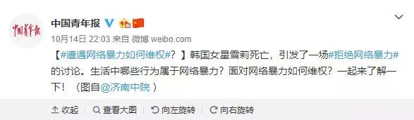 14日,中国青年报就雪莉事件发布微博称:生活中哪些行为属于网络暴力?面对网络暴力如何维权?