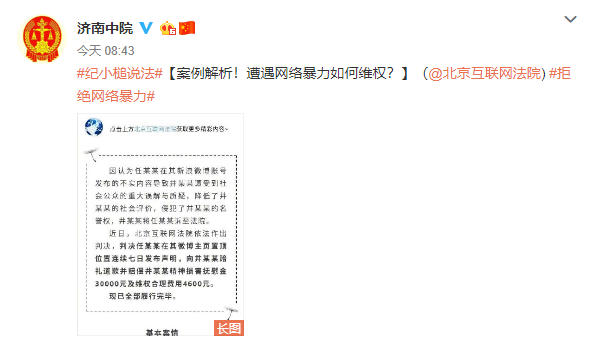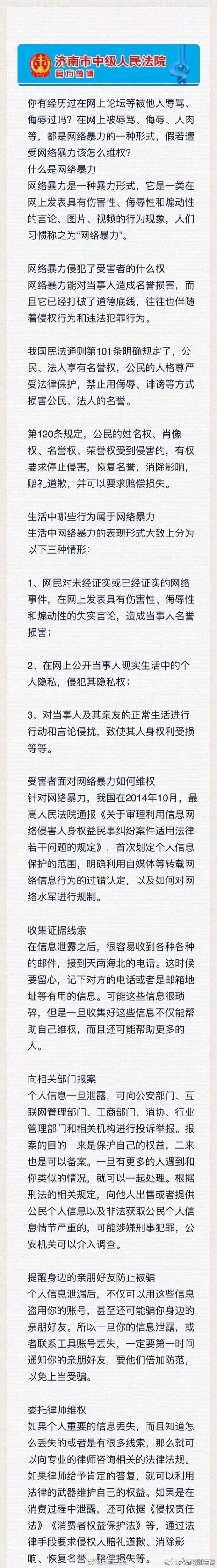 在此之前,济南中院还发布长微博,教大家遭遇了网络暴力如何维权。