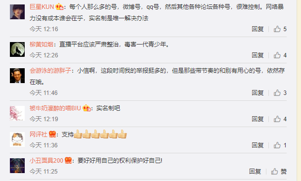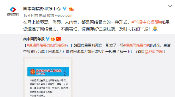 15日,国家网信办举报中心官方微博转发中国青年报的微博并表示:“在网上被辱骂、侮辱、人肉等,都是网络暴力的一种形式。举报中心提醒:如果您遭遇了网络暴力,不要害怕,请保存好证据线索,及时向我们举报!”。
