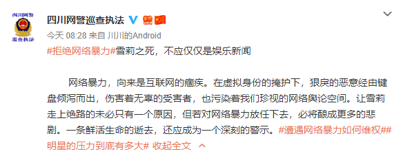 15日,四川网警巡查执法发布微博表示,雪莉之死,不应仅仅是娱乐新闻。该微博指出,网络暴力,向来是互联网的痼疾。在虚拟身份的掩护下,狠戾的恶意经由键盘倾泻而出,伤害着无辜的受害者,也污染着我们珍视的网络舆论空间。让雪莉走上绝路的未必只有一个原因,但若对网络暴力放任下去,必将酿成更多的悲剧。一条鲜活生命的逝去,还应成为一个深刻的警示。