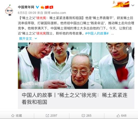 《“稀土之父”徐光宪:稀土紧紧连着我和祖国》资料图