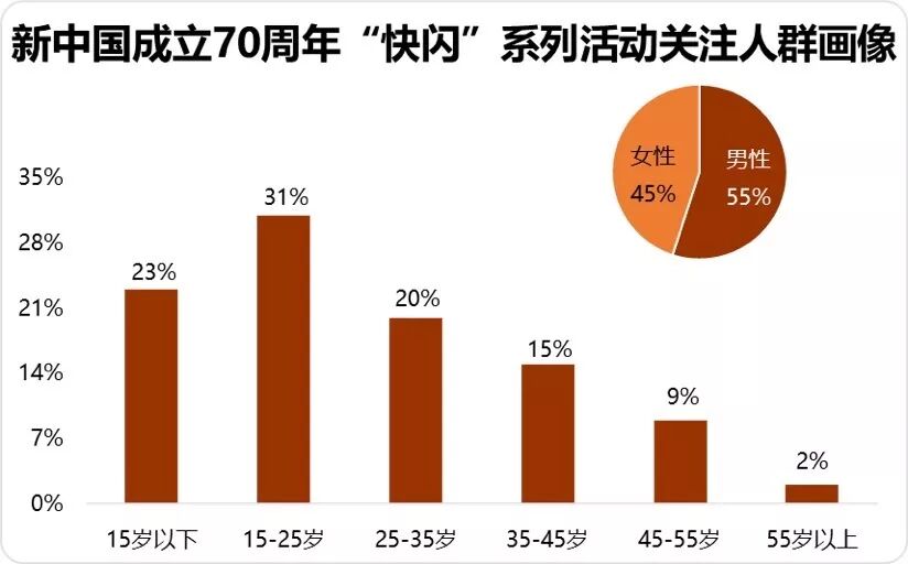 腾讯指数大数据显示,新中国成立70周年“快闪”系列活动在35岁以下网民群体中热度最高。其中,15岁至25岁、15岁以下、25岁至35岁网民讨论热度分别占比31%、23%、20%,合计超7成。“快闪”系列庆祝活动以活泼直白的表现形式吸引青年网民关注,激发和凝聚炙热的爱国之情,昭示青年一代对祖国的强烈认同感、归属感、自豪感。以往的“快闪”形式多“非严肃”“年轻态”“非主流”,对中老年群体吸引力有限,但此次系列活动同样吸引35岁以上网民关注。同时,相关活动关注讨论性别分布相较其他时政类话题更为均衡,表明女性网民群体的舆论参与率更为积极和主动。
