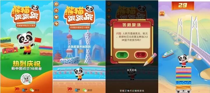 新华网联合腾讯微信推出公益性质的文化互动类微信小游戏“熊猫跳跳跳”。游戏中,通过卡片、箱子等道具和问答等环节,让用户在文化互动游戏中了解新中国成立70周年中的重要事件,了解新中国成立70年以来的建设成就。截至10月7日,该小游戏总曝光量达3.5亿,用户总互动次数约1.6亿次。