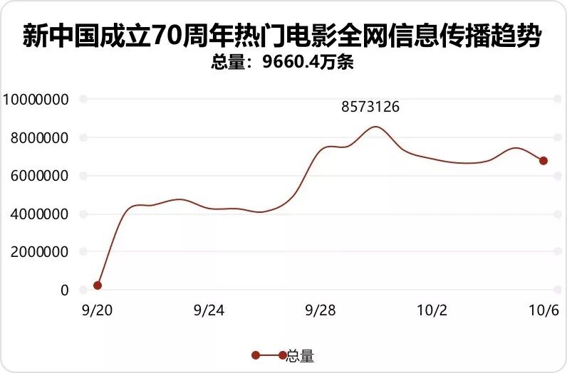 图5:新中国成立70周年热门电影全网信息传播趋势(数据统计时间:9月20日至10月6日)