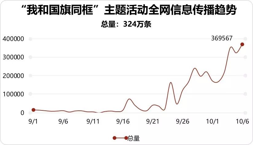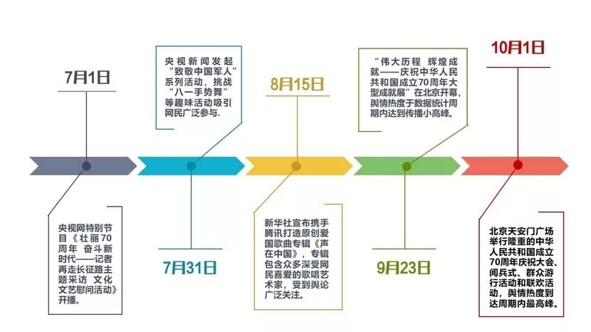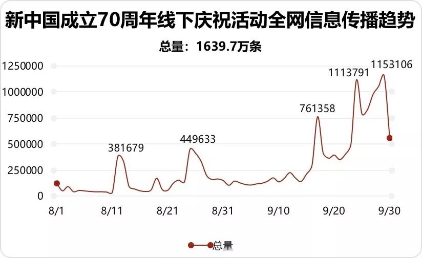 8月11日,人民日报社新媒体中心“时光博物馆”大篷车在深圳湾上演“点亮中国红”主题无人机、灯光秀表演,全网信息量达到周期内首次峰值,约38.2万条。8月25日,国家广电总局“我爱你中国”优秀电视剧百日展播活动启动,全网信息量攀升至45万条。9月17日,央视发布“我和国旗同框”“快闪”活动MV,新华社“七彩华夏 声在中国”音乐汇在国家大剧院举行,全信息量达76.1万条。9月23日,央视新闻在微博上发起“挂国旗 迎国庆”号召,多地掀起“我和国旗同框”热潮;庆祝中华人民共和国成立70周年大型成就展在北京开幕,全网信息量迅速攀升,并于24日至周期内次峰值达到113.4万条。9月29日,北京、南京、广州等地开启“表白祖国”“国庆”等主题灯光秀、无人机表演等,舆论热度持续高涨,于29日达到周期内峰值115.3万条。