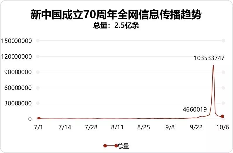 大数据显示,自2019年7月1日至10月6日,全网与新中国成立70周年主题相关的信息约2.5亿条。它们来自众多渠道。其中,微信公众平台(含转载)相关信息1.9亿条,微博相关信息3782.7万条,QQ空间相关信息2185.1万条,新闻网站相关信息(含转载)293.9万篇,论坛、博客等其他平台信息127.2万条。