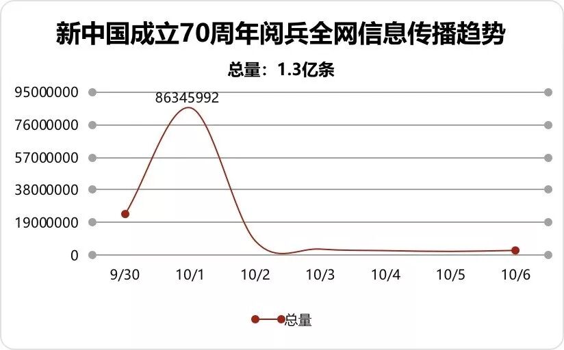 大数据显示,9月30日1时至10月6日,与新中国成立70周年阅兵相关信息全网传播总量约1.3亿条。其中,微信平台(含转载)相关信息约9218万条,微博相关信息约2242.8万条,QQ空间相关信息约1469.1万条,新闻网站相关信息(含转载)约28.9万篇,论坛、博客等其他平台信息约68.3万条。