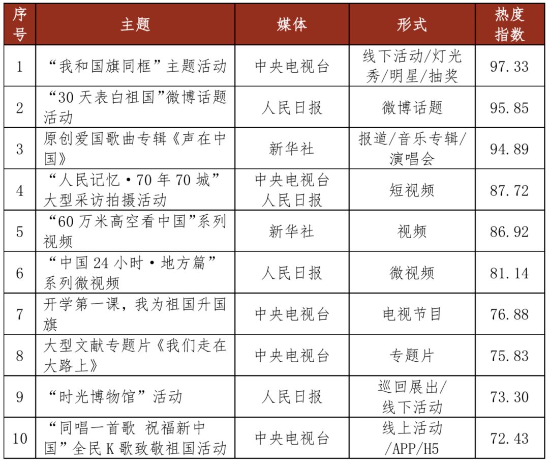 表1:国庆前夕三大央媒与新中国成立70周年相关热点话题