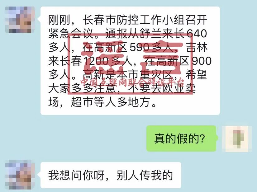 近日,微信等社交媒体上流传着这样一则消息:“刚刚,长春市防控工作小组召开紧急会议。通报从舒兰来长640多人,在高新区590多人,吉林来长春1200多人,在高新区900多人。高新是本市重灾区,希望大家多多注意,不要去欧亚卖场,超市等人多地方。”