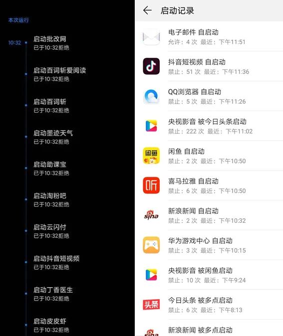 最近,有网友更新MIUI 12系统后,在其提供的功能中发现,单独启用一款App后,短时间内该App唤醒了十余款其他App应用,这种“关联启动”或“链式启动”的现象在安卓用户群体中引发热烈讨论,很多网友表示“不解”“后怕”。事实上,App自启动、关联启动等后台唤醒问题,在国内的安卓生态下已经存在了很多年了,很多手机厂商在操作系统层面也都会对类似的行为进行监控和记录,笔者在EMUI 9.1系统下也可以查看到App自启动和被关联唤醒的启动记录。如下图1所示。