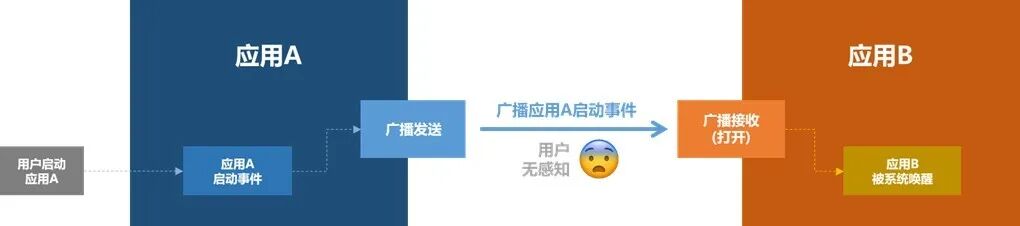 事件广播(Broadcast)是用于安卓应用与系统、应用与应用之间进行通信的方式。App应用通过系统提供的广播接收器服务(BroadcastReceiver)接收想要监听的广播,比如:当网络状态改变时,系统会产生一条广播,应用就能够接收到这条广播并被后台唤醒。大量的应用都是通过安卓的广播监听机制在后台启动运行。下图4为应用A发出广播事件,并被应用B接收后而触发启动的过程。