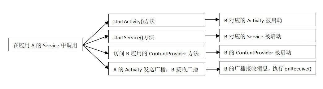 通过服务(Service)也可以实现应用间的唤醒功能,一般情况唤醒其他应用的服务用户是无感知的。如应用A可通过某个Service调用本身的四大组件提供的方法,实现应用B中相应组件的启动。如下图3所示。