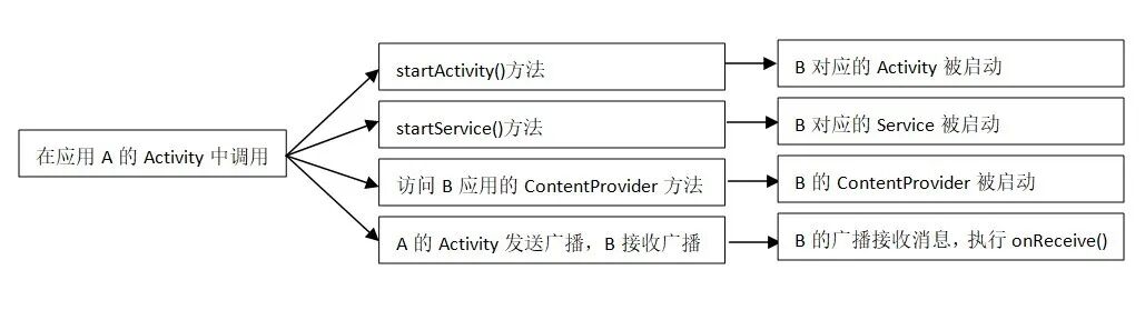 除了用户主动打开App这种大家周知的方式,在安卓系统下,提供了活动(Activity)、服务(Service)、广播(Broadcast)、内容提供(ContentProvider)四大组件,Activity和Service两个组件经常被用来实现跨应用的唤醒,Broadcast可用于通过监听广播事件实现自启动,ContentProvider组件较少应用在唤醒的场景。