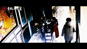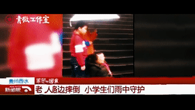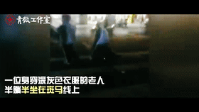 深夜,一位身穿深灰色衣服的老人半躺半坐在斑马线上,路过的两名身穿校服的小学生尝试着把老人搀扶起来。