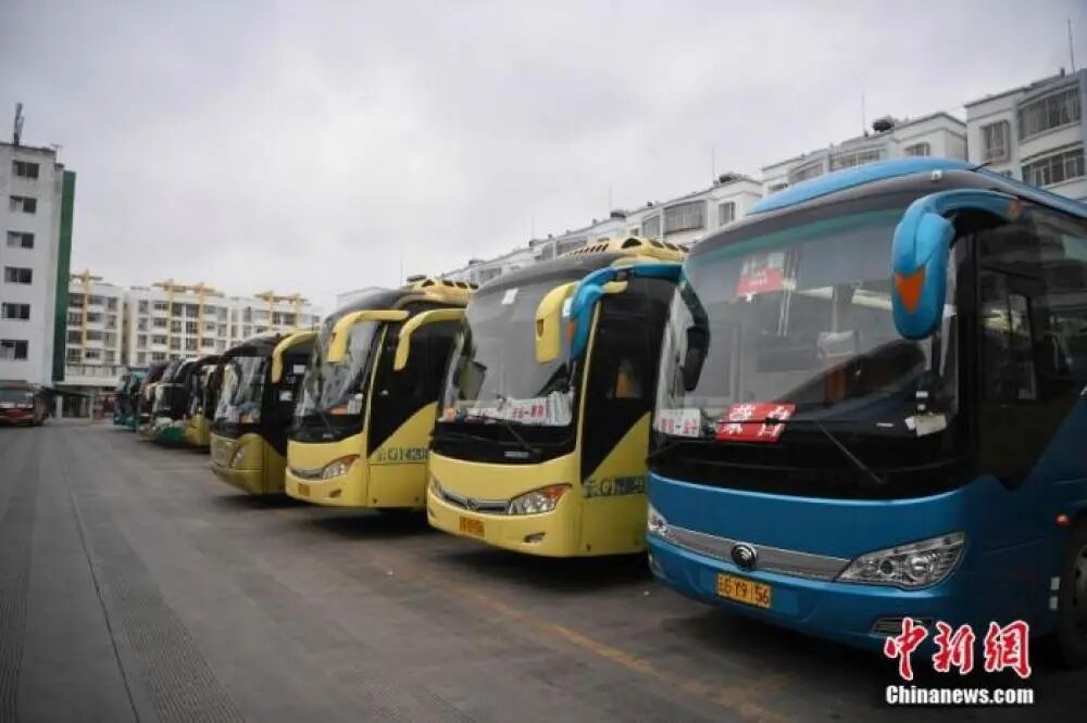 资料图:客运站停车场的客运班车。中新社记者 刘冉阳 摄