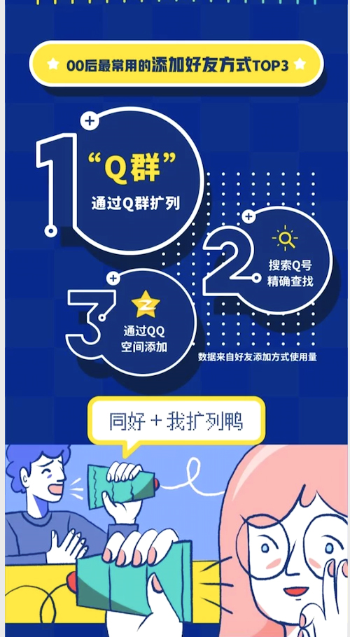 基于QQ平台,Z世代都喜欢扩列(即扩充好友列表),他们根据兴趣爱好结交朋友。资料显示,QQ扩列分二次元和三次元。前者结合动漫、古风音乐等二次元文化成为群组,后者通常以增加好友数量、个性签名、说说和日志的点赞为目的。