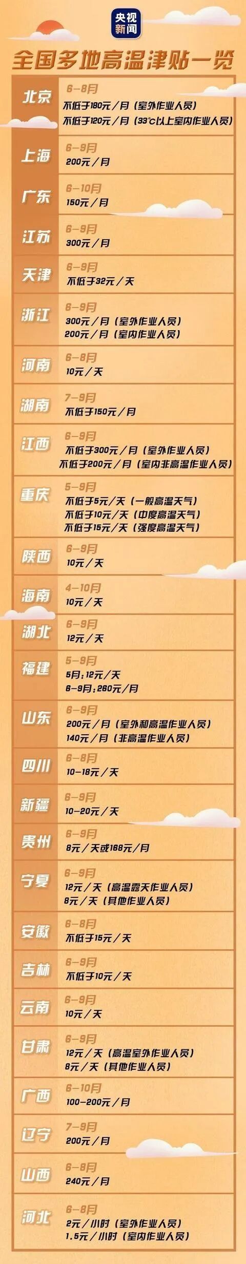 高温津贴目前分为按月、按天和按小时发放三类。从各省公布的高温津贴发放时长来看,多数省份是在6月至8月或9月之间。其中海南省的发放时间最长,为4月1日-10月31日,时间跨度长达7个月。河南发放时间为6月至8月,发放标准为10元/天。伴随着炎炎夏日,不少省份的高温津贴将持续发放。