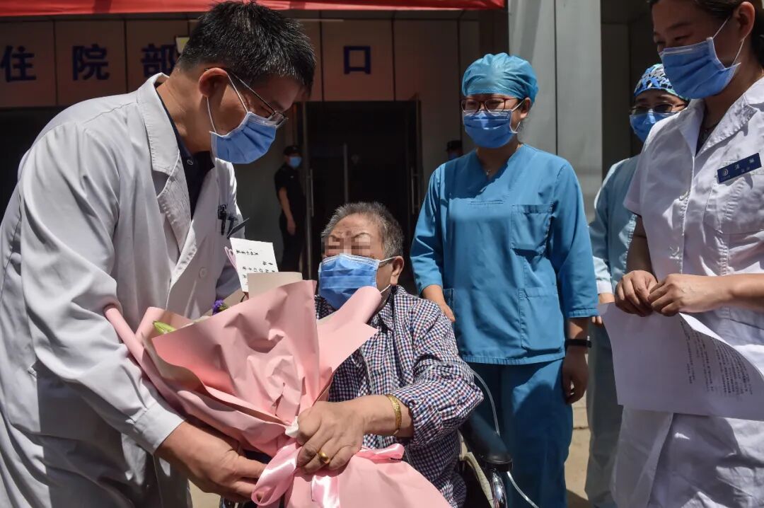 在这场严峻的抗疫斗争中,党和政府不惜一切代价,践行守护人民健康的庄严承诺。图为2020年5月13日,北京第一位成功脱离体外人工膜肺(ECMO)的新冠肺炎危重症患者、79岁的马女士从北京地坛医院康复出院,向医生献花表示感谢。新华社记者 彭子洋/摄