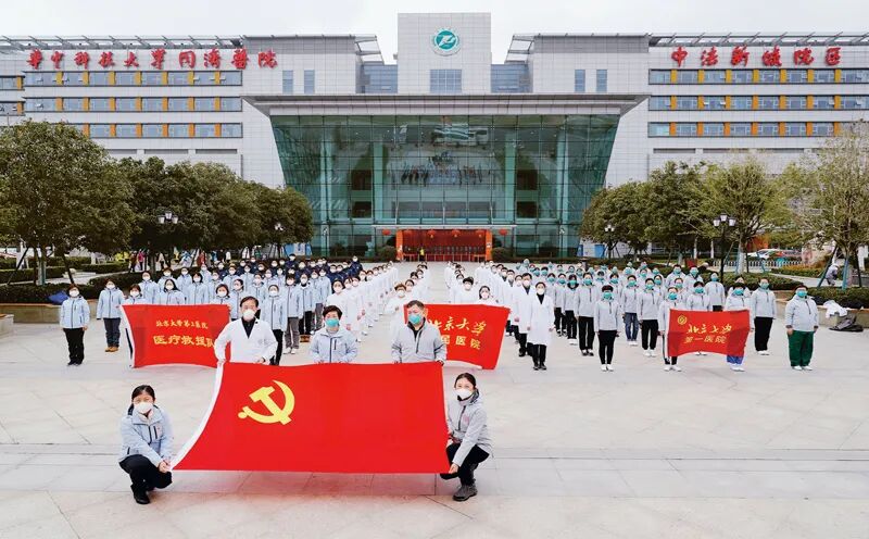 2020年3月1日,在华中科技大学同济医院中法新城院区,北京大学第一医院、北京大学人民医院、北京大学第三医院医疗救援队的党员和入党积极分子代表重温入党誓词。新华社记者 沈伯韩/摄
