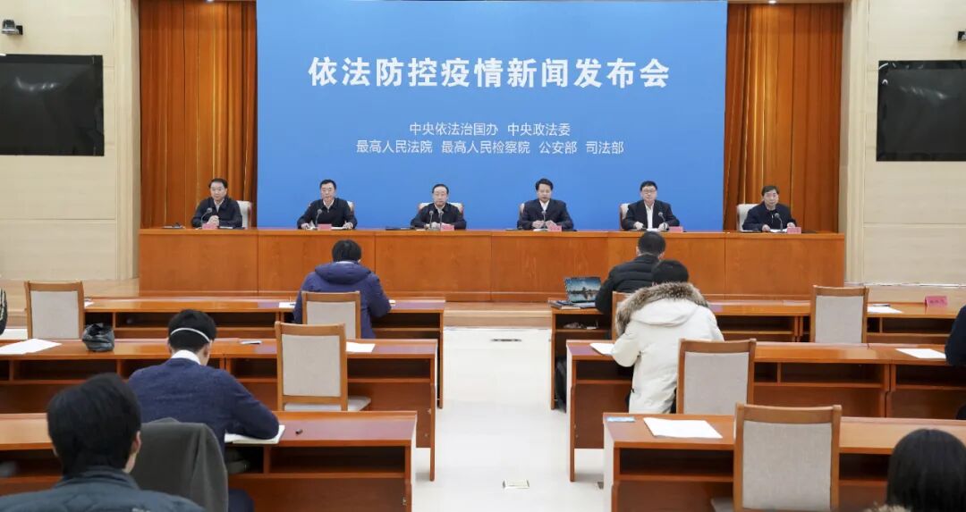 2020年2月10日,中央依法治国办、中央政法委、最高人民法院、最高人民检察院、公安部、司法部联合在京举行依法防控疫情新闻发布会。新华社发