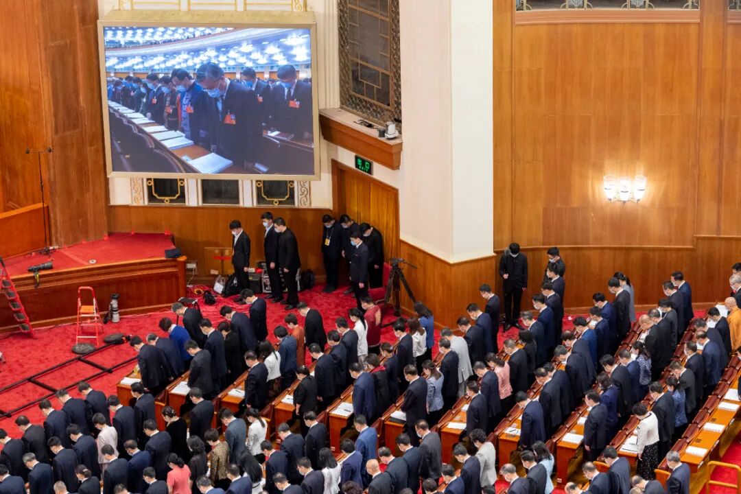 2020年5月22日,在十三届全国人大三次会议开幕会上,全体与会人员肃立默哀,向抗击新冠肺炎疫情牺牲烈士和逝世同胞表示深切哀悼。图为默哀现场。人民图片 翁奇羽/摄