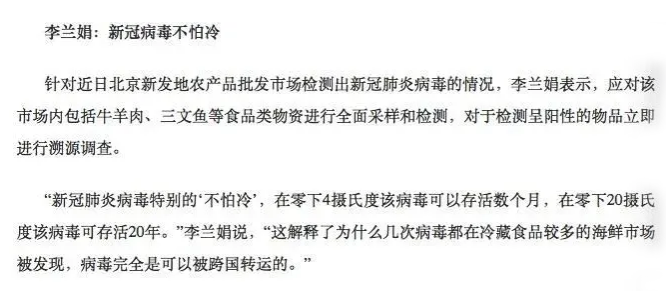 近日,一条关于李兰娟院士的报道被大量转发。报道称,李兰娟院士说“新冠肺炎病毒特别‘不怕冷’,在零下4℃该病毒可以存活数个月,在零下20℃该病毒可存活20年”。