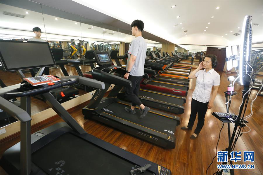 6月15日,青岛英吉多健康产业有限公司,营销人员通过广交会直播平台推介出口海外市场的健身器材产品。新华社 梁孝鹏 摄