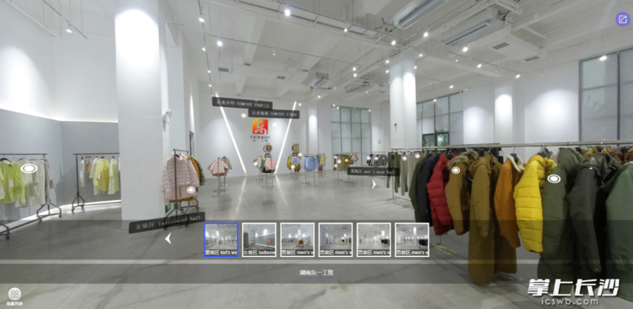 开展首日,湖南一家参展公司推出VR“云展厅”,偌大的展厅分为男装区、女装区和童装区。客商不但能360度“逛”展厅,而且看上哪件衣服,只要轻点鼠标,就能看到各个产品的详细介绍、3D展示。