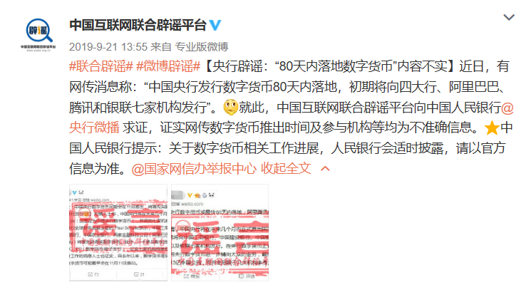 2019年8月,中国人民银行明确“加快推进我国法定数字货币(DC/EP)研发步伐”为2019年下半年重点工作之一,网上便有消息称“中国央行发行数字货币80天内落地”,随后,中国互联网联合辟谣平台独家报道《央行辟谣:“80天内落地数字货币”内容不实》。