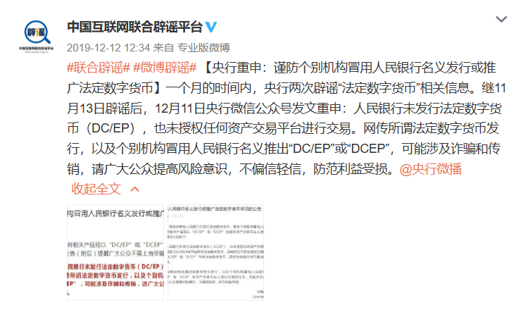 2019年11月,比特币市场持续上涨。“人民银行已发行法定数字货币”“区块链就是数字货币”等消息便充斥网络。一个月的时间里,央行两度发布《关于冒用人民银行名义发行或推广法定数字货币情况的公告》,澄清“未发布法定数字货币”。