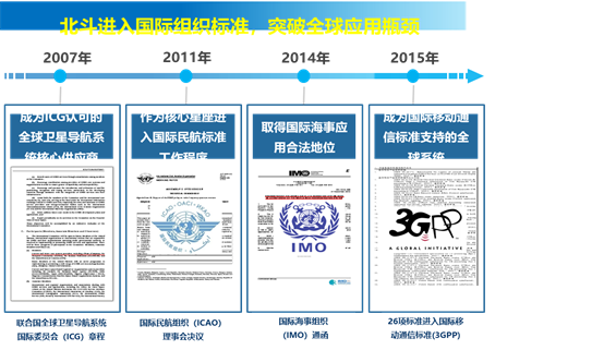 北斗积极进入民航、海事、通信、搜救等国际组织标准,获得进入国际主流应用领域的许可。