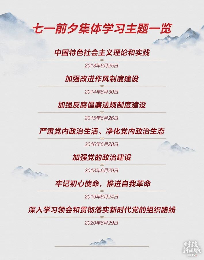 党的十八大以来,除2017年总书记另有视察活动外,每年七一前夕,中央政治局都会组织一次集体学习。2013年6月25日的集体学习以中国特色社会主义理论和实践为题,习近平在主持学习时说,这对贯彻落实党的十八大精神很有意义,也是对我们党成立92周年的最好庆祝。