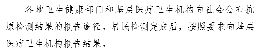 (五)各省(自治区、直辖市)卫生健康部门要制定抗原检测阳性结果报告相关规定,通过开发APP小程序、完善信息系统功能等方式,方便各类人员进行抗原检测结果报告,要将报告具体途径通过多种方式向社会公布。